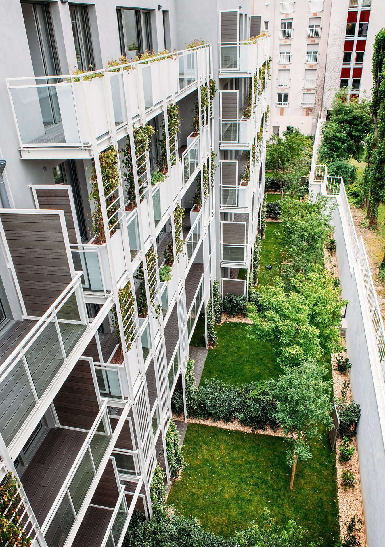 Nous avons proposé une implantation permettant que le plus grand linéaire possible de façade bénéficie des vues sur les jardins intérieurs tout en masquant une grande partie des pignons voisins.